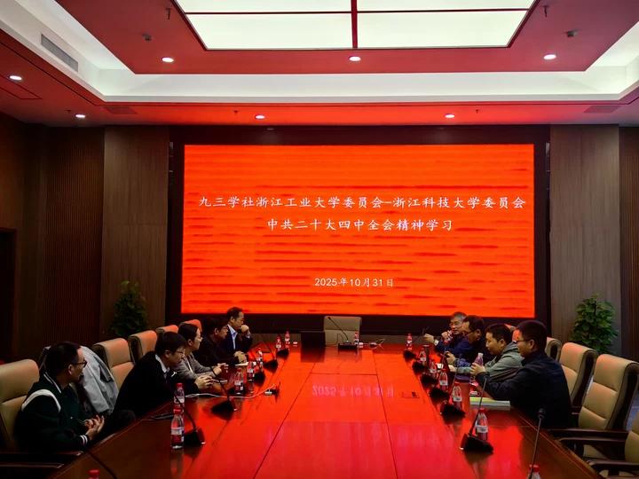 10月底,我校九三学社第一支社与九三学社浙江工业大学一支社联合举办中共二十届四中全会精神专题学习会。会议邀请浙江工业大学党委统战部常务副部长作专题宣讲,围绕全会精神内涵,结合国家发展大局与科技教育工作者的使命担当,深入阐释了民主党派成员在推进中国式现代化建设中的责任与担当。